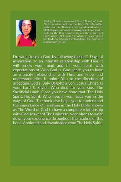 Drawing close to God, by following these 21 Days of inspiration, to an intimate relationship with Him. It will renew your mind and fill your spirit with expectations of Who God is. God needs you to have an intimate relationship with Him, and know and understand Him. It points You to the direction of accepting God's Only Begotten Son, Jesus Christ as your Lord & Savior, Who died for your sins, The Sacrificial Lamb. Once you have done that, The Holy Spirit, His Spirit, Who lives in you, leads you in the ways of God. The book also helps you to understand the importance of investing in the Holy Bible, known as The Word of God to have a complete relationship with God, Maker of The Universe. Note places to write down your experience throughout the reading of this book. Anointed and downloaded from The Holy Spirit.