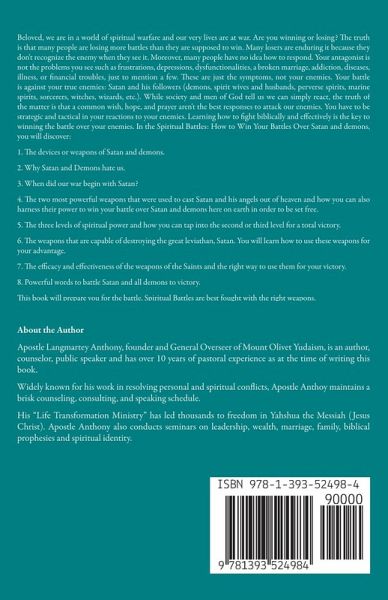 Beloved, we are in a world of spiritual warfare and our very lives are at war. Are you winning or losing? The truth is that many people are losing more battles than they are supposed to win. Many losers are enduring it because they don't recognize the enemy when they see it. Moreover, many people have no idea how to respond. Your antagonist is not the problems you see such as frustrations, depressions, dysfunctionalities, a broken marriage, addiction, diseases, illness, or financial troubles, just to mention a few. These are just the symptoms, not your enemies. Your battle is against your true enemies: Satan and his followers (demons, spirit wives and husbands, perverse spirits, marine spirits, sorcerers, witches, wizards, etc.). Nevertheless, Satan and demons are not afraid of a mere human like you, so how are you supposed to fight? More importantly, how are you supposed to win? While society and men of God tell us we can simply react, the truth of the matter is that a common wish, hope, and prayer aren't the best responses to attack our enemies. You have to be strategic and tactical in your reactions to your enemies. Learning how to fight biblically and effectively is the key to winning the battle over your enemies. In the Spiritual Battles: How to Win Your Battles Over Satan and demons, you will discover: ¿ The devices or weapons of Satan and demons. ¿ Why Satan and Demons hate us. ¿ When did our war begin with Satan? ¿ The two most powerful weapons that were used to cast Satan and his angels out of heaven. ¿ The Three Levels of Spiritual Power. ¿ The weapons that are capable of destroying the great leviathan, Satan. ¿ The efficacy and effectiveness of the weapons of the Saints. ¿ Powerful Words to Battle Satan and all Demons to victory. There is a powerful enemy out there to destroy you. You are on the battlefield, so you can't escape the war. This spiritual war has crucial consequences in your everyday life and its outcome will depend on whether you win or lose the war. Satan and demons are not just mere human beings that can be whipped with just a mere cane. To engage Satan and Demons, you need guidelines to win your battles over them. This book provides the guidelines to win your battles over Satan and demons. This book will prepare you for the battle. Spiritual Battles are best fought with the right weapons and as a result, courage replaces fear and victory takes the place of failure. The Holy Scripture says, "Fight the good fight of faith, lay hold on eternal life, whereunto thou art also called, and hast professed a good profession before many witnesses" (1 Timothy 6:12). Grab your copy now!