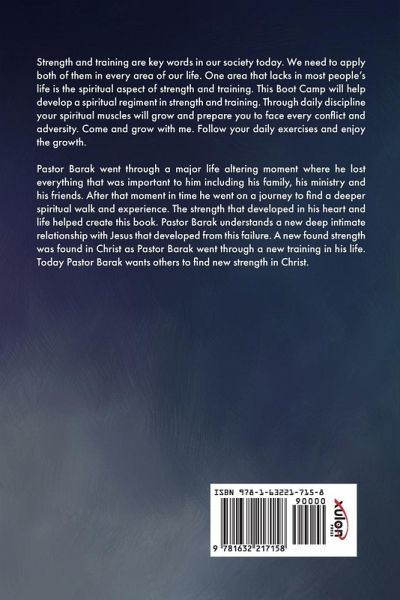 Strength and training are key words in our society today. We need to apply both of them in every area of our life. One area that lacks in most people's life is the spiritual aspect of strength and training. This Boot Camp will help develop a spiritual regiment in strength and training. Through daily discipline your spiritual muscles will grow and prepare you to face every conflict and adversity. Come and grow with me. Follow your daily exercises and enjoy the growth. Pastor Barak went through a major life altering moment where he lost everything that was important to him including his family, his ministry and his friends. After that moment in time he went on a journey to find a deeper spiritual walk and experience. The strength that developed in his heart and life helped create this book. Pastor Barak understands a new deep intimate relationship with Jesus that developed from this failure. A new found strength was found in Christ as Pastor Barak went through a new training in his life. Today Pastor Barak wants others to find new strength in Christ.