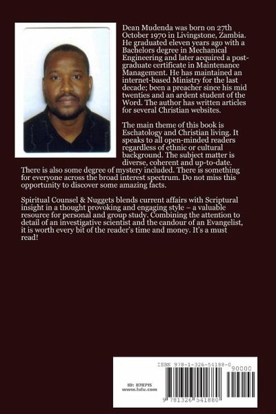 Spiritual Counsel & Nuggets explores themes that are timely, intriguing and difficult. It is not just another book. It mingles scientific and spiritual truths to deliver a depth of meaning that both inspires and edifies. The author demonstrates the relevance and credibility of the Holy Bible to the 21st century reader. Find out how to access the treasure hidden within the ancient texts and Dean's unique and intriguing insight. Learn what made an Engineer turn into an Evangelist. Prepare to be both challenged and stimulated. You will not look at the News the same way.