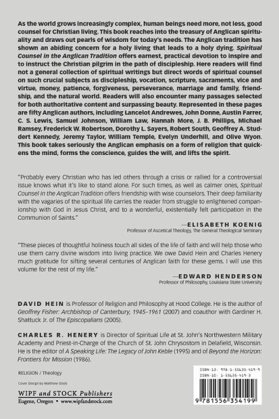 As the world grows increasingly complex, human beings need more, not less, good counsel for Christian living. This book reaches into the treasury of Anglican spirituality and draws out pearls of wisdom for today's needs. The Anglican tradition has shown an abiding concern for a holy living that leads to a holy dying. Spiritual Counsel in the Anglican Tradition offers earnest, practical devotion to inspire and to instruct the Christian pilgrim in the path of discipleship. Here readers will find not a general collection of spiritual writings but direct words of spiritual counsel on such crucial subjects as discipleship, vocation, scripture, sacraments, vice and virtue, money, patience, forgiveness, perseverance, marriage and family, friendship, and the natural world. Readers will also encounter many passages selected for both authoritative content and surpassing beauty. Represented in these pages are fifty Anglican authors, including Lancelot Andrewes, John Donne, Austin Farrer, C. S. Lewis, Samuel Johnson, William Law, Hannah More, J. B. Phillips, Michael Ramsey, Frederick W. Robertson, Dorothy L. Sayers, Robert South, Geoffrey A. Studdert Kennedy, Jeremy Taylor, William Temple, Evelyn Underhill, and Olive Wyon. This book takes seriously the Anglican emphasis on a form of religion that quickens the mind, forms the conscience, guides the will, and lifts the spirit.
