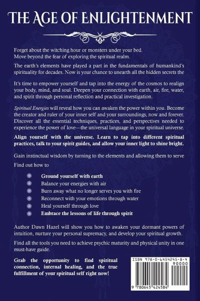 The Age of Enlightenment The earth's elements have played a part in the fundamentals of humankind's spirituality for decades. Now is your chance to unearth all the hidden secrets the universe has been hiding. It's time to empower yourself and tap into the energy of the cosmos to realign your body, mind, and soul. Deepen your connection with earth, air, fire, water, and spirit through personal reflection and practical investigation. Spiritual Energies will reveal how you can awaken the power within you. Become the creator and ruler of your inner self and your surroundings, now and forever. Discover all the essential techniques, practices, and perspectives needed to experience the power of love-the universal language in your spiritual universe. Align yourself with the universe. Learn to tap into different spiritual practices, talk to your spirit guides, and allow your inner light to shine bright. Gain instinctual wisdom by turning to the elements and allowing them to serve you. Ground yourself with earth Balance your energies with air Burn away what no longer serves you with fire Reconnect with your emotions through water Heal yourself through love Embrace the lessons of life through spirit Show you how to awaken your dormant powers of intuition, nurture your personal supremacy, and develop your spiritual growth.Find all the tools you need to achieve psychic maturity and physical unity in one must-have guide. Grab the opportunity to find spiritual connection, internal healing, and the true fulfillment of your spiritual self right now!