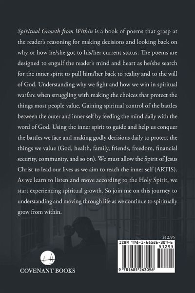 Spiritual Growth from Within is a book of poems that grasp at the reader's reasoning for making decisions and looking back on why or how he/she got to his/her current status. The poems are designed to engulf the reader's mind and heart as he/she search for the inner spirit to pull him/her back to reality and to the will of God. Understanding why we fight and how we win in spiritual warfare when struggling with making the choices that protect the things most people value. Gaining spiritual control of the battles between the outer and inner self by feeding the mind daily with the word of God. Using the inner spirit to guide and help us conquer the battles we face and making godly decisions daily to protect the things we value (God, health, family, friends, freedom, financial security, community, and so on). We must allow the Spirit of Jesus Christ to lead our lives as we aim to reach the inner self (ARTIS). As we learn to listen and move according to the Holy Spirit, we start experiencing spiritual growth. So join me on this journey to understanding and moving through life as we continue to spiritually grow from within.