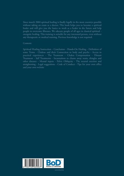 Since march 2004 spiritual healing is finally legally possible in the most countrys without taking an exam as a doctor. This book helps you to become a spiritual healer and will give you the basics to work as a healer in the future and help people to overcome illnesses. We educate people of all ages in classical spiritual - energetic healing. This training is suitable for any interested person, even without any therapeutic or medical training. Previous knowledge is not required.Content: Spiritual Healing Instruction - Conclusion - Hands-On Healing - Definition of some Terms - Chakras and their Connection to body and psyche - Access to practical experiences - The Treatment - Chakra Compensation - Distant Treatment - Self Treatments - Incantations to charm away warts, shingles and other diseases - Mental inputs - Pelvic Obliquity - The neutral erection and straightening - Legal suggestions - Code of Conduct - Tips for your own office and your own website