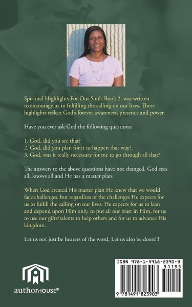 Spiritual Highlights For Our Souls Book 2, was written to encourage us in fulfilling the calling on our lives. These highlights reflect God's forever awareness, presence and power. Have you ever ask God the following questions: 1. God, did you see that? 2. God, did you plan for it to happen that way?. 3. God, was it really necessary for me to go through all that? The answers to the above questions have not changed. God sees all, knows all and He has a master plan. When God created His master plan He knew that we would face challenges, but regardless of the challenges He expects for us to fulfill the calling on our lives. He expects for us to lean and depend upon Him only, to put all our trust in Him, for us to use our gifts/talents to help others and for us to advance His kingdom. Let us not just be hearers of the word, Let us also be doers!!!