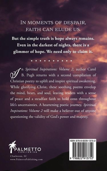Are you feeling adrift in a sea of hopelessness? Discover the soul soothing power of God's eternal love and reclaim hope in the possibilities of life. In moments of despair, faith can elude us. But the simple truth is hope always remains. Even in the darkest of nights, there is a glimmer of hope. We need only to claim it. In Spiritual Inspirations: Volume 2, author Carol B. Pugh returns with a second compilation of Christian poetry to inspire spiritual awakening. While glorifying God, Pugh's soothing poems envelop the mind, heart, and soul to: ¿ Heal emotional wounds ¿ Restore hope in the hopeless ¿ Fuel spiritual curiosity and foster spiritual growth ¿ Remind us that all things are possible through Christ This heartening poetic journey will make a believer out of even the strongest of doubters, and men and women of all ages will benefit from Pugh's encouraging words of wisdom, leaving those who are spiritually curious with a desire for continued growth and exploration within the Christian faith.