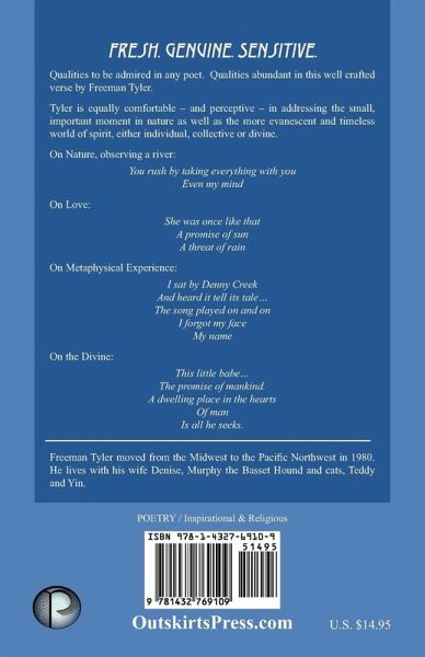 Fresh. Genuine. Sensitive. Qualities to be admired in any poet. Qualities abundant in this well crafted verse by Freeman Tyler. Tyler is equally comfortable -- and perceptive - in addressing the small, important moment in nature as well as the more evanescent and timeless world of spirit, either individual, collective or divine. On Nature, observing a river: You rush by taking everything with you Even my mind On Love: She was once like that A promise of sun A threat of rain On Metaphysical Experience: I sat by Denny Creek And heard it tell its tale... The song played on and on I forgot my face My name On the Divine: This little babe... The promise of mankind. A dwelling place in the hearts Of man Is all he seeks. Freeman Tyler moved from the Midwest to the Pacific Northwest in 1980. He lives with his wife Denise, Murphy, the Basset Hound from Hades, and the cats, Teddy and Yin. He was last seen being chased into the forest of faded memories by a pack of rabid chipmunks.