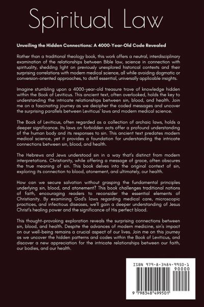 Unveiling the Hidden Connections: A 4000-Year-Old Code Revealed Rather than a traditional theology book, this work offers a neutral, interdisciplinary examination of the relationships between Bible law, science in connection with spirituality, shedding light on previously unexplored historical contexts and their surprising correlations with modern medical science, all while avoiding dogmatic or conversion-oriented approaches, to distill essential, universally applicable insights. Imagine stumbling upon a 4000-year-old treasure trove of knowledge hidden within the Book of Leviticus. This ancient text, often overlooked, holds the key to understanding the intricate relationships between sin, blood, and health. Join me on a fascinating journey as we decipher the coded messages and uncover the surprising parallels between Leviticus' laws and modern medical science. The Book of Leviticus, often regarded as a collection of archaic laws, holds a deeper significance. Its laws on forbidden acts offer a profound understanding of the human body and its responses to sin. This ancient text predates modern medical science, yet it provides a foundation for understanding the intricate connections between sin, blood, and health. The Hebrews and Jews understood sin in a way that's distinct from modern interpretations. Christianity, while offering a message of grace, often obscures the true meaning of sin. This book delves into the original context of sin, exploring its connection to blood, atonement, and ultimately, our health. How can we secure salvation without grasping the fundamental principles underlying sin, blood, and atonement? This book challenges traditional notions of faith, encouraging readers to reconsider the essential elements of Christianity. By examining God's laws regarding medical care, microscopic practices, and infectious diseases, we'll gain a deeper understanding of Jesus Christ's healing power and the significance of His perfect blood. This thought-provoking exploration reveals the surprising connections between sin, blood, and health. Despite the advances of modern medicine, sin's impact on our well-being remains a crucial aspect of our lives. Join me on this journey as we uncover the hidden patterns and codes within the Book of Leviticus, and discover a new appreciation for the intricate relationships between our faith, our bodies, and our health. Unveiling the Hidden Connections: A 4000-Year-Old Code Revealed Rather than a traditional theology book, this work offers a neutral, interdisciplinary examination of the relationships between Bible law, science in connection with spirituality, shedding light on previously unexplored historical contexts and their surprising correlations with modern medical science, all while avoiding dogmatic or conversion-oriented approaches, to distill essential, universally applicable insights. Imagine stumbling upon a 4000-year-old treasure trove of knowledge hidden within the Book of Leviticus. This ancient text, often overlooked, holds the key to understanding the intricate relationships between sin, blood, and health. Join me on a fascinating journey as we decipher the coded messages and uncover the surprising parallels between Leviticus' laws and modern medical science.