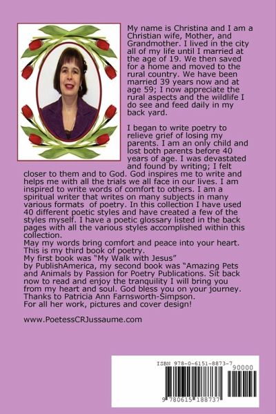 This is a book of God inspired poetry written to inspire and help others that have trials to face in life! Here you will find poetic words of love and wisdom portrayed in various ways to give comfort and peace, It is a most wonderful spiritual God loving book with many lovely pictures throughout the pages. Poets reading will truly enjoy seeing over 40 different styles of poetry displayed with a full glossary to explain each style! A book flowing with words like spiritual waters! A Must!