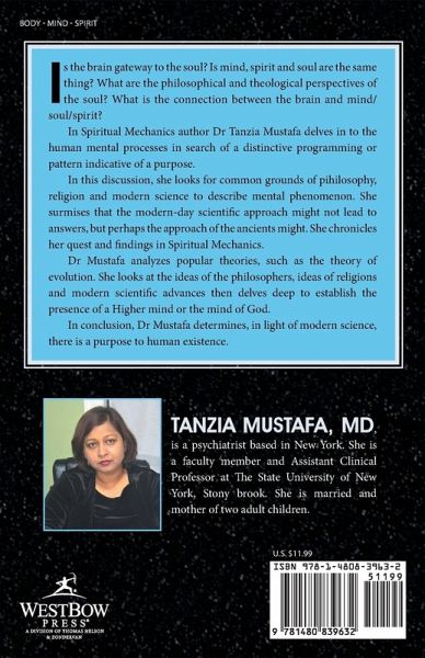 Is the brain gateway to the soul? Is mind, spirit and soul are the same thing? What are the philosophical and theological perspectives of the soul? What is the connection between the brain and mind/soul/spirit? In Spiritual Mechanics author Dr Tanzia Mustafa delves in to the human mental processes in search of a distinctive programming or pattern indicative of a purpose. In this discussion, she looks for common grounds of pihilosophy, religion and modern science to describe mental phenomenon. She surmises that the modern-day scientific approach might not lead to answers, but perhaps the approach of the ancients might. She chronicles her quest and findings in Spiritual Mechanics. Dr Mustafa analyzes popular theories, such as the theory of evolution. She looks at the ideas of the philosophers, ideas of religions and modern scientific advances then delves deep to establish the presence of a Higher mind or the mind of God. In conclusion, Dr Mustafa determines, in light of modern science, there is a purpose to human existence.