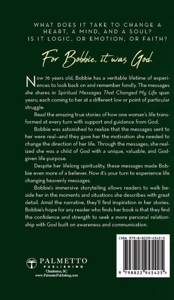 The author of Twelve Steps: One Journey is back with another heart-stirring narrative. Based in her own experiences, Bobbie shares the messages she's received from God that have upended her life into a fulfilling existence. What does it take to change a heart, a mind, and a soul? Is it logic, or emotion, or faith? For Bobbie, it was God. Now 76 years old, Bobbie has a veritable lifetime of experiences to look back on and remember fondly. The messages she shares in Spiritual Messages That Changed My Life span years; each coming to her at a different low or point of particular struggle. Read the amazing true stories of how one woman's life transformed at every turn with support and guidance from God. Bobbie was astonished to realize that the messages sent to her were real-and they gave her the motivation she needed to change the direction of her life. Through the messages, she realized she was a child of God with a unique, valuable, and God-given life purpose. Despite her lifelong spirituality, these messages made Bobbie even more of a believer. Now it's your turn to experience life changing heavenly messages. Bobbie's immersive storytelling allows readers to walk beside her in the moments and situations she describes with great detail. Amid the narrative, they'll find inspiration in her stories. Bobbie's hope for any reader who finds her book is that they find the confidence and strength to seek a more personal relationship with God built on awareness and communication.