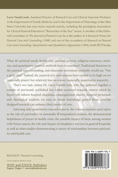 What do spiritual needs, health care, pastoral services, religious resources, statistics, and quantitative research methods have in common? Traditional literature in the pastoral care, counseling, and education movement probably would say, ""Not a great deal."" Indeed, the pastoral arts and sciences have tended to be high on art (especially praxis) but relatively low on science (especially quantitative research). That's too bad, claims Dr. Larry VandeCreek, who has gathered together a sample of previously published but widely scattered research reports which he hopes will inform hospital chaplains, congregational pastors, hospital personnel, and theological students on ways in which knowledge gained from carefully designed research can enhance their project of care. Selecting only quantitative research reports, the volume explores such topics as the role of spirituality in terminally ill hospitalized patients, the demonstrated helpfulness of prayer in health crisis, the possible impact of hope among women with breast cancer, the role and impact of chaplaincy services in general hospitals, as well as other studies demonstrating a variety of relationships between spirituality and health care.