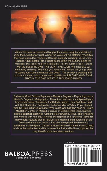 Within this book are practices that give the reader insight and abilities to raise their evolutionary right to hear the Voice of God. Different modalities that have worked for masters all through antiquity including; Jesus Christ, Buddha, Chief Seattle, etc. Finding peace within the self and being the message, this seems to be the obligation of all the Earth's people. Being with the BLESSED ONE, THE LIGHT, THE LOVE. We must take our spirituality seriously. Why have you come here? Where will you go after dropping your robe or what we call "death". The Divinity is awaiting and you do not have to die to know and be within the BELOVED GOD, THAT, THAT IS, THE ONE WITH THE THOUSAND NAMES.