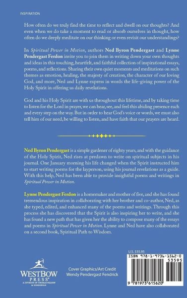 How often do we truly find the time to reflect and dwell on our thoughts? And even when we do take a moment to read or absorb ourselves in thought, how often do we deeply meditate on our thinking or even revisit our understandings? In Spiritual Power in Motion, authors Ned Byron Pendergast and Lynne Pendergast Ferdon invite you to join them in writing down your own thoughts and ideas in this touching, heartfelt, and faithful collection of inspirational essays, poems, and reflections. Sharing their own quiet moments and meditations on such themes as emotion, healing, the majesty of creation, the character of our loving God, and more, Ned and Lynne express in words the life-giving power of the Holy Spirit in offering us daily revelations. God and his Holy Spirit are with us throughout this lifetime, and by taking time to listen for the Lord in prayer, we can hear, see, and feel this abiding presence each and every step on the way. But in order to hear Gods voice or words, we must also tell him of our need, be willing to listen, and have faith that our prayers are heard.