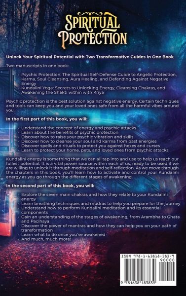 Unlock Your Spiritual Potential with Two Transformative Guides in One Book Two manuscripts in one book:Psychic Protection: The Spiritual Self-Defense Guide to Angelic Protection, Karma, Soul Cleansing, Aura Healing, and Defending Against Negative Energy Kundalini Yoga: Secrets to Unlocking Energy, Cleansing Chakras, and Awakening the Shakti within with Kriya In the first part of this book, you will:Understand the concept of energy and psychic attacks Learn about the benefits of psychic protection Discover how to raise your psychic vibration and skills Discover how to cleanse your soul and karma from past energies Learn to cleanse your space from negative influences Discover how to heal your aura Understand the power of angelic protection and learn to summon an archangel to shield you from psychic attacks Learn to use the symbols, plants, and stones to protect you from psychic attacks Discover spells and rituals to protect you against hexes and curses Learn to protect your home, pets, and loved ones from psychic attacks In the second part of this book, you will:Explore the seven main chakras and how they relate to your Kundalini energy Learn breathing techniques and mudras to help you prepare for the journey Understand how to perform Kundalini meditation and its essential components Gain an understanding of the stages of awakening, from Arambha to Ghata and Pacihaya Discover the power of mantras and how they can help you on your path of transformation Learn what to do once you've awakened And much, much more!
