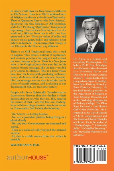 In today's world there is a New Science and there is an Old Science. There is an Old Traditional form of Religion and there is a New form of Spirituality. There is Quantum Physics (the New Science), Epigenetics (the New Biology), an Old Psychology and a New Psychology (Spiritual or Transpersonal Psychology). Each of these New forms tell us of a world very different from that in which we have presumed to live. There are realms of reality and impacts on our genes, bodies, and behaviors never before understood. The messages that emerge in the Old and in the New are very different. There is an Old Traditional Jesus that is tied to dogma, rules, rituals, notions of separation, and exoteric practices that neglect and distort the true message of Jesus. There is a New Jesus who is the Original Jesus that you find in his esoteric (inner) messages, like the Jesus you find in A Course In Miracles. This is a Jesus whose focus is on the heart and the psychology of human nature, the human mind, and on human behavior. His true message was on what is within, and it is one of transformation, and awakening to our Transcendent Self, our true inner nature. People who have Spiritually Transformative Experiences discover that their bodies or their personalities are not who they are. They discover the essence of what it was that Jesus was teaching. Some of his teachings about our true inner nature or Transcendent Self include the following: Our Source is a Loving Essence. You are a powerful spiritual being living in a physical body. You and your Consciousness are immortal and eternal. There is a realm of reality beyond the material universe. All that is visible comes from that which is invisible. WALTER KANIA, Ph.D.