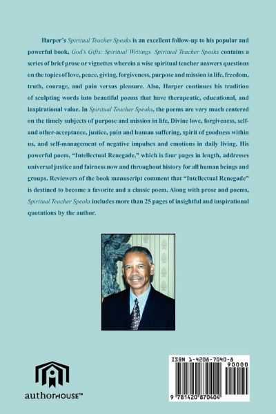 Harper''s Spiritual Teacher Speaks is an excellent follow-up to his popular and powerful book, God's Gifts: Spiritual Writings. Spiritual Teacher Speaks contains a series of brief prose or vignettes wherein a wise spiritual teacher answers questions on the topics of love, peace, giving, forgiveness, purpose and mission in life, freedom, truth, courage, and pain versus pleasure. Also, Harper continues his tradition of sculpting words into beautiful poems that have therapeutic, educational, and inspirational value. In Spiritual Teacher Speaks, the poems are very much centered on the timely subjects of purpose and mission in life, Divine love, forgiveness, self- and other-acceptance, justice, pain and human suffering, spirit of goodness within us, and self-management of negative impulses and emotions in daily living. His powerful poem, "Intellectual Renegade," which is four pages in length, addresses universal justice and fairness now and throughout history for all human beings and groups. Reviewers of the book manuscript comment that "Intellectual Renegade" is destined to become a favorite and a classic poem. Along with prose and poems, Spiritual Teacher Speaks includes more than 25 pages of insightful and inspirational quotations by the author.