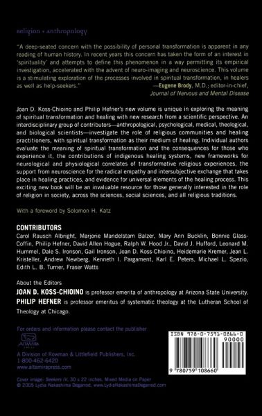 This excellent book has it all - state of the art studies of spiritual transformation from medicine, anthropology, and neuroscience all ably reflected upon by philosophy and theology and made relevant to care and healing in the clinical situation. A wonderful contribution. -- Don Browning, University of Chicago, author of Christian Ethics and the Moral Psychologies The book that Joan Koss-Chioino and Phillip Hefner put together does a remarkable job of addressing critical questions...This book showcases well how multidisciplinarity can be a critical vehicle. Ethos - Journal Of The Society For Psychological Athropology, September 2008 "A deep-seated concern with the possibility of personal transformation is apparent in any reading of human history. In recent years this concern has taken the form of an interest in "spirituality" and attempts to define this phenomenon in a way permitting its empirical investigation, accelerated with the advent of neuro-imaging and neuroscience. This volume is a stimulating exploration of the processes involved in spiritual transformation, in healers as well as help-seekers." -- Eugene B. Brody, and Mental Disease, Editor in Chief, Journal of Nervous and Mental Disease