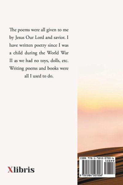 The poems were all given to me by Jesus Our Lord and savior. I have written poetry since I was a child during the World War II as we had no toys, dolls, etc. Writing poems and books were all I used to do.