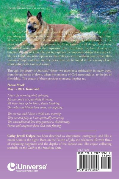 In Spiritual Visions, author Cathy Jewell Dalpra considers how God is part of everything in life?how we can visualize the spirituality of life through Him. Whether it is the turning of darkness into light, the opening of the heavens, or the sweet songs of the birds, His presence is felt everywhere, in all things. The poetry in this collection looks at the inspiration that can change the lives of many or brighten the day of a few. Her poetry explores the important things that matter in life, our loved ones who support us, the ability to write poignant poetry that offers visions of hope and love, and the peace that can be found in the serenity of our relationship with God and nature. Through the poetry in Spiritual Visions, we experience spirituality in many ways, from the quietness of dawn, when the presence of God surrounds us, to the joy of friendship. The beauty of these precious moments inspires us. Dawn Break May 1, 2011, from God I hear the morning birds chirping. My cats and I are peacefully listening. We have been up for hours, dawn breaking. Our other cat friends have come, are napping. The six cats and I have a 4:00 a.m. meeting. They eat and play as I am spiritually centering. The unconditional love they generate is disbelieving. Poems and scriptures from God start flowing.
