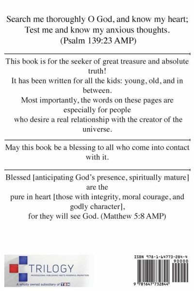 Search me thoroughly O God, and know my heart; Test me and know my anxious thoughts. (Psalm 139:23 AMP) This book is for the seeker of great treasure and absolute truth! It has been written for all the kids: young, old, and in between. Most importantly, the words on these pages are especially for people who desire a real relationship with the creator of the universe. May this book be a blessing to all who come into contact with it. Blessed [anticipating God's presence, spiritually mature] are the pure in heart [those with integrity, moral courage, and godly character], for they will see God. (Matthew 5:8 AMP)