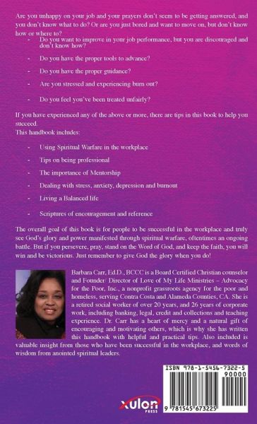Are you unhappy with your job and your prayers don't seem to be getting answered, and you don't know what to do? Or are you just bored and want to move on, but don't know how or where to? * Do you want to improve your job performance, but you are discouraged and don't know how? * Do you have the proper tools to advance? * Do you have the proper guidance? * Are you stressed and experiencing burn out? * Do you feel you've been treated unfairly? If you have experienced any of the above or more, there are tips in this book to help you succeed. This handbook includes: * Using Spiritual Warfare in the workplace * Tips on being professional * The importance of Mentorship * Dealing with stress, anxiety, depression and burnout * Living a Balanced life * Scriptures of encouragement and reference The overall goal of this book is for people to be successful in the workplace and truly see God's glory and power manifested through spiritual warfare, oftentimes an ongoing battle. But if you persevere, pray, stand on the Word of God, and keep the faith, you will win and be victorious. Just remember to give God the glory when you do! Barbara Carr, Ed.D., BCCC is a Board Certified Christian counselor and Founder/ Director of Love of My Life Ministries - Advocacy for the Poor, Inc., a nonprofit grassroots agency for the poor and homeless, serving Contra Costa and Alameda Counties, CA. She is a retired social worker of over 20 years, and 26 years of corporate work, including banking, legal, credit and collections and teaching experience. Dr. Carr has a heart of mercy and a natural gift of encouraging and motivating others, which is why she has written this handbook with helpful and practical tips. Also included is valuable insight from those who have been successful in the workplace, and words of wisdom from anointed spiritual leaders.