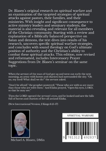 Dr. Blasen's original research on spiritual warfare and an examination of the targeted strategies of spiritual attacks against pastors, their families, and their ministries. With insight and significant consequence to active ministry leaders and seminary students, the material is also revealing and relevant for all members of the Christian community. Starting with a review and explanation of a Biblically balanced perspective on Satan and demons, the text dives into results of his research, uncovers specific spiritual warfare strategies, and concludes with sound theology on God's ultimate position of authority and the Christian's ability to combat these spiritual attacks. This edition, now revised and reformatted, includes Intercessory Prayer Suggestions from Dr. Blasen's seminar on the same topic.