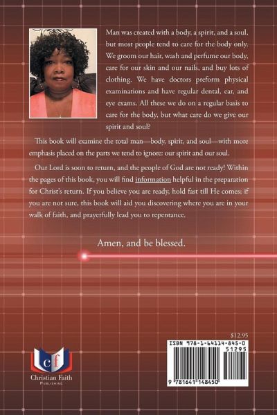 Man was created with a body, a spirit, and a soul, but most people tend to care for the body only. We groom our hair, wash and perfume our body, care for our skin and our nails, and buy lots of clothing. We have doctors preform physical examinations and have regular dental, ear, and eye exams. All these we do on a regular basis to care for the body, but what care do we give our spirit and soul? This book will examine the total man—body, spirit, and soul—with more emphasis placed on the parts we tend to ignore: our spirit and our soul. Our Lord is soon to return, and the people of God are not ready! Within the pages of this book, you will find information helpful in the preparation for Christ’s return. If you believe you are ready, hold fast till He comes; if you are not sure, this book will aid you discovering where you are in your walk of faith, and prayerfully lead you to repentance. Amen, and be blessed.