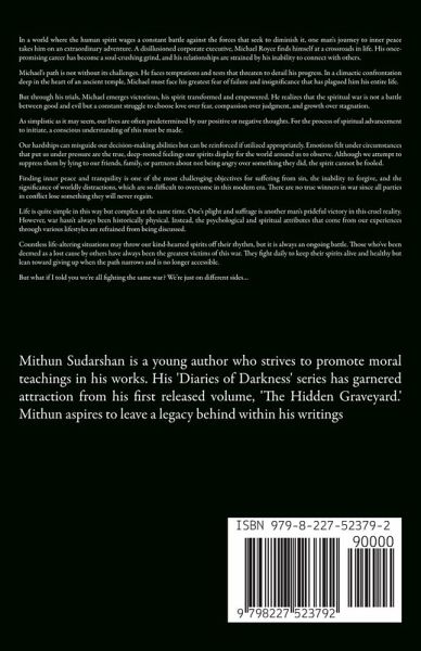 In a world where the human spirit wages a constant battle against the forces that seek to diminish it, one man's journey to inner peace takes him on an extraordinary adventure. A disillusioned corporate executive, Michael Royce finds himself at a crossroads in life. His once-promising career has become a soul-crushing grind, and his relationships are strained by his inability to connect with others. Michael's path is not without its challenges. He faces temptations and tests that threaten to derail his progress. In a climactic confrontation deep in the heart of an ancient temple, Michael must face his greatest fear of failure and insignificance that has plagued him his entire life. As simplistic as it may seem, our lives are often predetermined by our positive or negative thoughts. For the process of spiritual advancement to initiate, a conscious understanding of this must be made. Our hardships can misguide our decision-making abilities but can be reinforced if utilized appropriately. Emotions felt under circumstances that put us under pressure are the true, deep-rooted feelings our spirits display for the world around us to observe. Although we attempt to suppress them by lying to our friends, family, or partners about not being angry over something they did, the spirit cannot be fooled. Finding inner peace and tranquility is one of the most challenging objectives for suffering from sin, the inability to forgive, and the significance of worldly distractions, which are so difficult to overcome in this modern era. There are no true winners in war since all parties in conflict lose something they will never regain. Life is quite simple in this way but complex at the same time. One's plight and suffrage is another man's prideful victory in this cruel reality. However, war hasn't always been historically physical. Instead, the psychological and spiritual attributes that come from our experiences through various lifestyles are refrained from being discussed. Countless life-altering situations may throw our kind-hearted spirits off their rhythm, but it is always an ongoing battle. Those who've been deemed as a lost cause by others have always been the greatest victims of this war. They fight daily to keep their spirits alive and healthy but lean toward giving up when the path narrows and is no longer accessible. But what if I told you we're all fighting the same war? We're just on different sides...