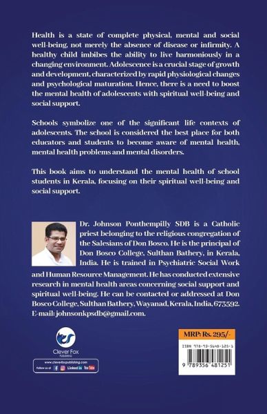 Health is a state of complete physical, mental and social well-being, not merely the absence of disease or infirmity. A healthy child imbibes the ability to live harmoniously in a changing environment. Adolescence is a crucial stage of growth and development, characterized by rapid physiological changes and psychological maturation. Hence, there is a need to boost the mental health of adolescents with spiritual well-being and social support. Schools symbolize one of the significant life contexts of adolescents. The school is considered the best place for both educators and students to become aware of mental health, mental health problems and mental disorders. This book aims to understand the mental health of school students in Kerala, focusing on their spiritual well-being and social support.