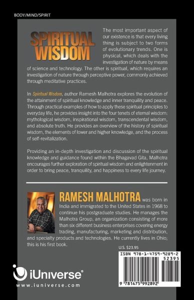 The most important aspect of our existence is that every living thing is subject to two forms of evolutionary trends. One is physical, which deals with the investigation of nature by means of science and technology. The other is spiritual, which requires an investigation of nature through perceptive power, commonly achieved through meditative practices. In Spiritual Wisdom, author Ramesh Malhotra explores the evolution of the attainment of spiritual knowledge and inner tranquility and peace. Through practical examples of how to apply these spiritual principles to everyday life, he provides insight into the four tenets of eternal wisdom: mythological wisdom, inspirational wisdom, transcendental wisdom, and absolute truth. He provides an overview of the history of spiritual wisdom, the elements of lower and higher knowledge, and the process of self-revitalization. Providing an in-depth investigation and discussion of the spiritual knowledge and guidance found within the Bhagavad Gita, Malhotra encourages further exploration of spiritual wisdom and enlightenment in order to bring peace, tranquility, and happiness to every life journey.