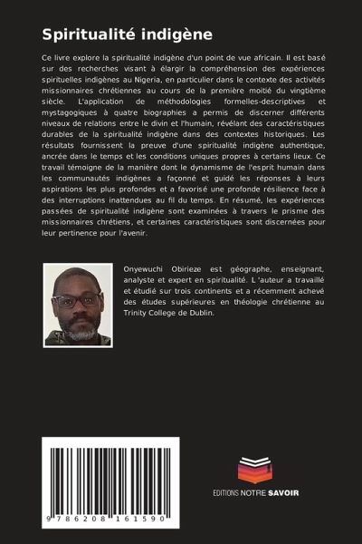 Ce livre explore la spiritualité indigène d'un point de vue africain. Il est basé sur des recherches visant à élargir la compréhension des expériences spirituelles indigènes au Nigeria, en particulier dans le contexte des activités missionnaires chrétiennes au cours de la première moitié du vingtième siècle. L'application de méthodologies formelles-descriptives et mystagogiques à quatre biographies a permis de discerner différents niveaux de relations entre le divin et l'humain, révélant des caractéristiques durables de la spiritualité indigène dans des contextes historiques. Les résultats fournissent la preuve d'une spiritualité indigène authentique, ancrée dans le temps et les conditions uniques propres à certains lieux. Ce travail témoigne de la manière dont le dynamisme de l'esprit humain dans les communautés indigènes a façonné et guidé les réponses à leurs aspirations les plus profondes et a favorisé une profonde résilience face à des interruptions inattendues au fil du temps. En résumé, les expériences passées de spiritualité indigène sont examinées à travers le prisme des missionnaires chrétiens, et certaines caractéristiques sont discernées pour leur pertinence pour l'avenir.