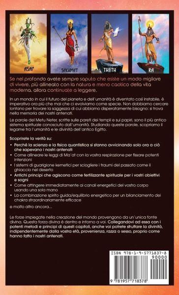 Se nel profondo avete sempre saputo che esiste un modo migliore di vivere, più allineato con la natura e meno caotico della vita moderna, allora continuate a leggere. In un mondo in cui il futuro del pianeta e dell'umanità è diventato così instabile, è imperativo ora più che mai che ci evolviamo come specie. Non dobbiamo cercare lontano per trovare la saggezza di cui abbiamo disperatamente bisogno: si trova nella memoria dei nostri antenati. Le parole del Metu Neter, scritte sulle pareti dei templi e sui papiri, sono il più antico sistema spirituale conosciuto dall'umanità. Studiando queste parole, scopriamo il legame tra l'umanità e le divinità dell'antico Egitto. Scoprirete la verità su:Perché la scienza e la fisica quantistica si stanno avvicinando solo ora a ciò che sapevano i nostri antenati Come allineare le leggi di Ma'at con la vostra respirazione per fissare potenti intenzioni I sistemi di guarigione kemetici per sciogliere i traumi del passato come il ghiaccio nel deserto Antichi principi che agiscono come fertilizzante spirituale per i vostri obiettivi e sogni Come attingere immediatamente ai canali energetici del vostro corpo usando una sola mano Perché potreste attrarre nella vostra vita ciò che non vi piace affatto Gli antichi testi che gli scienziati russi hanno usato per ricreare incredibili dispositivi di guarigione Un potente approccio kemetico ai chakra che non troverete da nessun'altra parte La combinazione spirito guida/equilibrio energetico per un bilanciamento dei chakra straordinariamente efficace Un capitolo illustrato *bonus* sullo yoga per un benessere e un allineamento super potenziati e molto altro ancora... Le forze impiegate nella creazione del mondo provengono da un'unica fonte divina. Questa forza divina è dentro e intorno a voi. Collegandovi ad essa con i potenti metodi e principi di questi capitoli, anche voi potrete sfruttare la divinità, indipendentemente dalla vostra età, provenienza, razza o sesso, proprio come hanno fatto i nostri antenati. Quindi, se volete uscire da un'esistenza a bassa vibrazione ed entrare in sintonia con la vera divinità, girate la prima pagina.