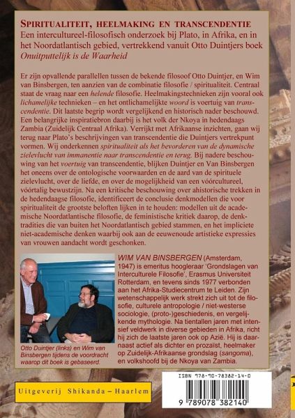 De filosofen Otto Duintjer en Wim van Binsbergen lijken op elkaar t.a.v. spiritualiteit. Hoe kan filosofie helen? Vooral ook door lichamelijke technieken. Het ontlichamelijkte woord is voertuig van transcendentie. Transcendentie wordt nader onderzocht o.m. m.b.t. het Nkoya volk in Zambia. Vervolgens gaan wij terug naar Plato over transcendentie. Spiritualiteit blijkt het bevorderen van de zielevlucht van immanentie naar transcendentie en terug. Duintjer en Van Binsbergen zijn het oneens over voorwaarden en aard van de zielevlucht, over de liefde, en over de mogelijkheid van een vóórcultureel, vóórtalig bewustzijn. Na kritiek op de ahistorische trend in de hedendaagse filosofie, presenteert het boek denkmodellen voor spiritualiteit: uit de Noordatlantische filosofie, de feministische kritiek daarop, de denktradities van buiten het Noordatlantisch gebied , en het impliciete niet-academische denken (o.m. eeuwenoude artistieke expressies van vrouwen).