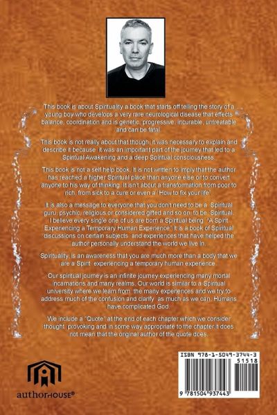 This book is about Spirituality a book that starts off telling the story of a young boy who develops a very rare neurological disease that effects balance, coordination and is genetic, progressive, incurable, untreatable and can be fatal. This book is not really about that though, it was necessary to explain and describe it because it was an important part of the journey that led to a Spiritual Awakening and a deep Spiritual consciousness. This book is not a self help book, It is not written to imply that the author has reached a higher Spiritual place than anyone else or to convert anyone to his way of thinking. It isn't about a transformation from poor to rich, from sick to a cure or even a "How to fix your life". It is also a message to everyone that you don't need to be a Spiritual guru, psychic, religious or considered gifted and so on, to be Spiritual. I believe every single one of us are born a Spiritual being "A Spirit Experiencing a Temporary Human Experience".It is a book of Spiritual discussions on certain subjects and experiences that have helped the author personally understand the world we live in. Spirituality, is an awareness that you are much more than a body that we are a Spirit experiencing a temporary human experience. Our spiritual journey is an infinite journey experiencing many mortal incarnations and many realms. Our world is similar to a Spiritual university where we learn from the many experiences and we try to address much of the confusion and clarify as much as we can. Humans have complicated God. We include a "Quote" at the end of each chapter which we consider thought provoking and in some way appropriate to the chapter.It does not mean that the original author of the quote does.