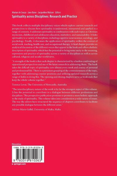 "The interdisciplinary nature of the work is by far the strongest aspect of this volume. It has the potential to contribute to a dialogue between different professions and disciplines. This prospective publication promises to promote a more holistic approach to the study of spirituality. This volume takes into consideration a wide variety of issues. The way the editors havestructured the sequence of chapters contributes to facilitateany possible dialogue between the different areas."Adrian-Mario Gellel, University of Malta, Malta