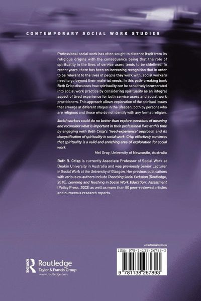 For much of the twentieth century, professional social work sought to distance itself from its religious origins with the consequence being that the role of spirituality in the lives of service users tended to be sidelined. Yet it is clear that many people begin to explore their spirituality precisely at times when they are trying to make sense of difficult life circumstances or experiences and may come into contact with social workers. In recent years, there has been an increasing understanding that in order to be relevant to the lives of people they work with, social workers need to go beyond their material needs, but there is little understanding of how spirituality can be sensitively incorporated into practice, especially when either practitioners or service users have no religious affiliation or there is no shared religious background. In this pathbreaking volume Beth Crisp offers social workers ideas of beginning conversations in which spiritual values and beliefs may surface, allowing service users to respond from their own framework and to begin to discuss the specific religious or spiritual practices and beliefs which are important to them. She considers spirituality in the context of lived experience, a perspective that she argues breaks down any mystique and suspicion of explicitly religious language by focusing on language and experiences with which most people can identify. Such a framework allows exploration of issues that emerge at different stages in the lifespan, both by persons who are religious and those who do not identify with any formal religion. Most literature on spirituality within social work refers to the elderly, to those who are sick or have been bereaved, yet, as Crisp points out, spirituality is important for people of all ages and not just at seemingly exceptional moments.