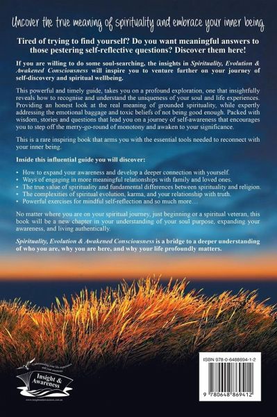 Uncover the true meaning of spirituality and embrace your inner being. Tired of trying to find yourself? Do you want meaningful answers to those pestering self-reflective questions? Discover them here! If you are willing to do some soul-searching, the insights in Spirituality, Evolution & Awakened Consciousness will inspire you to venture further on your journey of self-discovery and spiritual wellbeing. This powerful and timely guide takes you on a profound exploration, one that insightfully reveals how to recognise and understand the uniqueness of your soul and life experiences. Providing an honest look at the real meaning of grounded spirituality, while expertly addressing the emotional baggage and toxic beliefs of not being good enough. Packed with wisdom, stories and questions that lead you on a journey of self-awareness that encourages you to step off the merry-go-round of monotony and awaken to your significance. This is a rare inspiring book that arms you with the essential tools needed to reconnect with your inner being. Inside this influential guide you will discover: · How to expand your awareness and develop a deeper connection with yourself. · Ways of engaging in more meaningful relationships with family and loved ones. · The true value of spirituality and fundamental differences between spirituality and religion. · The complexities of spiritual evolution, karma, and your relationship with truth. · Powerful exercises for mindful self-reflection and so much more... No matter where you are on your spiritual journey, just beginning or a spiritual veteran, this book will be a new chapter in your understanding of your soul purpose, expanding your awareness, and living authentically.