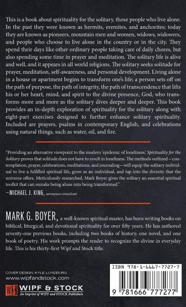 This is a book about spirituality for the solitary, those people who live alone. In the past they were known as hermits, eremites, and anchorites; today they are known as pioneers, mountain men and women, widows, widowers, and people who choose to live alone in the country or in the city. They spend their days like other ordinary people taking care of daily chores, but also spending some time in prayer and meditation. The solitary life is alive and well, and it appears in all world religions. The solitary seeks solitude for prayer, meditation, self-awareness, and personal development. Living alone in a house or apartment begins to transform one's life; a person sets off on the path of purpose, the path of integrity, the path of transcendence that lifts his or her heart, mind, and spirit to the divine presence, God, who transforms more and more as the solitary dives deeper and deeper. This book provides an in-depth exploration of spirituality for the solitary along with eight-part exercises designed to further enhance solitary spirituality. Included are prayers, psalms in contemporary English, and celebrations using natural things, such as water, oil, and fire.