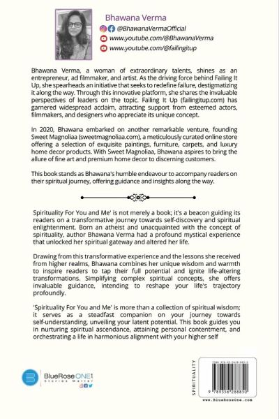 Spirituality For You and Me' is not merely a book; it's a beacon guiding its readers on a transformative journey towards self-discovery and spiritual enlightenment. Born an atheist and unacquainted with the concept of spirituality, author Bhawana Verma had a profound mystical experience that unlocked her spiritual gateway and altered her life.Drawing from this transformative experience and the lessons she received from higher realms, Bhawana combines her unique wisdom and warmth to inspire readers to tap their full potential and ignite life-altering transformations. Simplifying complex spiritual concepts, she offers invaluable guidance, intending to reshape your life's trajectory profoundly. 'Spirituality For You and Me' is more than a collection of spiritual wisdom; it serves as a steadfast companion on your journey towards self-understanding, unveiling your latent potential. This book guides you in nurturing spiritual ascendance, attaining personal contentment, and orchestrating a life in harmonious alignment with your higher self.