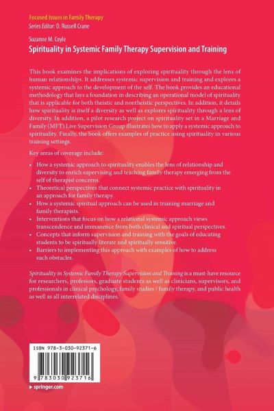This book examines the implications of exploring spirituality through the lens of human relationships. It addresses systemic supervision and training and explores a systemic approach to the development of the self. The book provides an educational methodology that lays a foundation in describing an operational model of spirituality that is applicable for both theistic and nontheistic perspectives. In addition, it details how spirituality is itself a diversity as well as explores spirituality through a lens of diversity. In addition, a pilot research project on spirituality set in a MFT Live Supervision Group illustrates how to apply a systemic approach to spirituality. Finally, the book offers examples of practice using spirituality in various training settings.