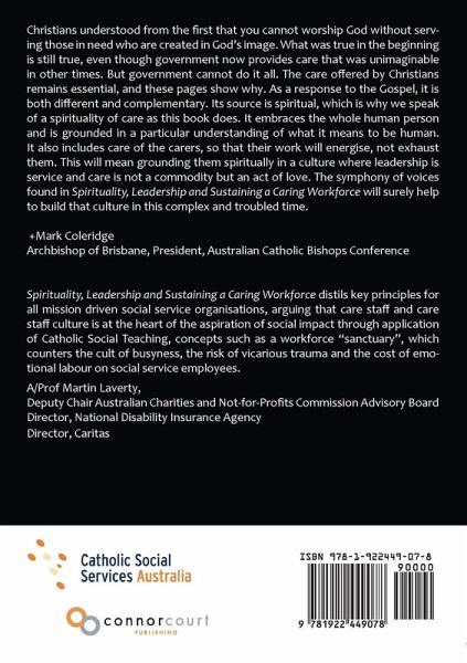 Christians understood from the first that you cannot worship God without serving those in need who are created in God's image. What was true in the beginning is still true, even though government now provides care that was unimaginable in other times. But government cannot do it all. The care offered by Christians remains essential, and these pages show why. As a response to the Gospel, it is both different and complementary. Its source is spiritual, which is why we speak of a spirituality of care as this book does. It embraces the whole human person and is grounded in a particular understanding of what it means to be human. It also includes care of the carers, so that their work will energise, not exhaust them. This will mean grounding them spiritually in a culture where leadership is service and care is not a commodity but an act of love. The symphony of voices found in Spirituality, Leadership and Sustaining a Caring Workforce will surely help to build that culture in this complex and troubled time. +Mark Coleridge, Archbishop of Brisbane, President, Australian Catholic Bishops Conference Spirituality, Leadership and Sustaining a Caring Workforce distils key principles for all mission driven social service organisations, arguing that care staff and care staff culture is at the heart of the aspiration of social impact through application of Catholic Social Teaching, concepts such as a workforce "sanctuary", which counters the cult of busyness, the risk of vicarious trauma and the cost of emotional labour on social service employees. -- A/Prof Martin Laverty, Deputy Chair Australian Charities and Not-for-Profits Commission Advisory Board Director, National Disability Insurance Agency, Director, Caritas