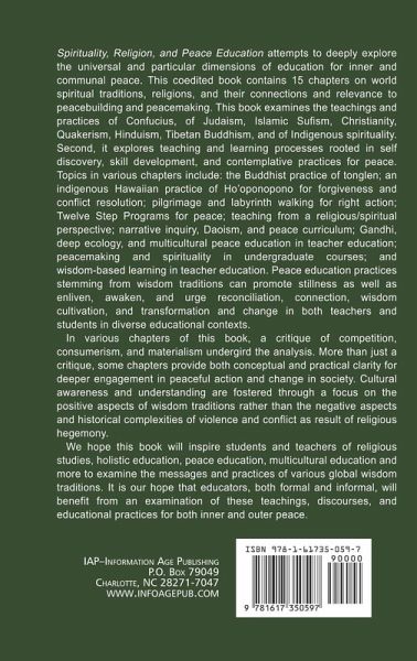A volume in Peace Education Series Editors Ian Harris, University of Wisconsin, Milwaukee, Edward J. Brantmeier, Colorado State University, and Jing Lin, University of Maryland, Spirituality, Religion, and Peace Education attempts to deeply explore the universal and particular dimensions of education for inner and communal peace. This co-edited book contains fifteen chapters on world spiritual traditions, religions, and their connections and relevance to peacebuilding and peacemaking. This book examines the teachings and practices of Confucius, of Judaism, Islamic Sufism, Christianity, Quakerism, Hinduism, Tibetan Buddhism, and of Indigenous spirituality. Secondly, it explores teaching and learning processes rooted in self discovery, skill development, and contemplative practices for peace. Topics in various chapters include: the Buddhist practice of tonglen; an indigenous Hawaiian practice of Ho'oponopono for forgiveness and conflict resolution; pilgrimage and labyrinth walking for right action; Twelve Step Programs for peace; teaching from a religious/spiritual perspective; narrative inquiry, Daoism, and peace curriculum; Gandhi, deep ecology, and multicultural peace education in teacher education; peacemaking and spirituality in undergraduate courses; and wisdom-based learning in teacher education. Peace education practices stemming from wisdom traditions can promote stillness as well as enliven, awaken, and urge reconciliation, connection, wisdom cultivation, and transformation and change in both teachers and students in diverse educational contexts. In various chapters of this book, a critique of competition, consumerism, and materialism undergird the analysis. More than just a critique, some chapters provide both conceptual and practical clarity for deeper engagement in peaceful action and change in society. Cultural awareness and understanding are fostered through a focus on the positive aspects of wisdom traditions rather than the negative aspects and historical complexities of violence and conflict as result of religious hegemony.