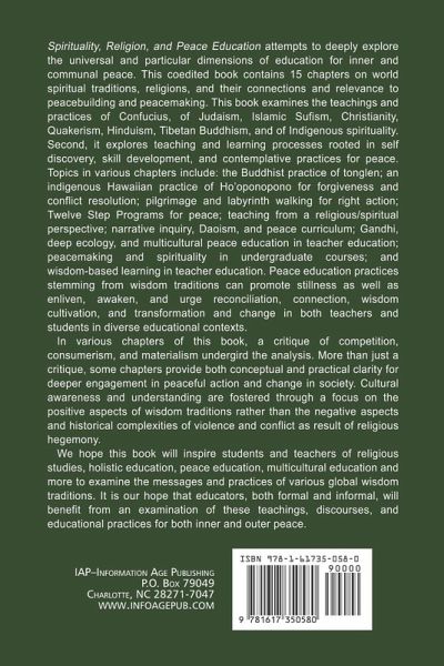A volume in Peace Education Series Editors Ian Harris, University of Wisconsin, Milwaukee, Edward J. Brantmeier, Colorado State University, and Jing Lin, University of Maryland, Spirituality, Religion, and Peace Education attempts to deeply explore the universal and particular dimensions of education for inner and communal peace. This co-edited book contains fifteen chapters on world spiritual traditions, religions, and their connections and relevance to peacebuilding and peacemaking. This book examines the teachings and practices of Confucius, of Judaism, Islamic Sufism, Christianity, Quakerism, Hinduism, Tibetan Buddhism, and of Indigenous spirituality. Secondly, it explores teaching and learning processes rooted in self discovery, skill development, and contemplative practices for peace. Topics in various chapters include: the Buddhist practice of tonglen; an indigenous Hawaiian practice of Ho'oponopono for forgiveness and conflict resolution; pilgrimage and labyrinth walking for right action; Twelve Step Programs for peace; teaching from a religious/spiritual perspective; narrative inquiry, Daoism, and peace curriculum; Gandhi, deep ecology, and multicultural peace education in teacher education; peacemaking and spirituality in undergraduate courses; and wisdom-based learning in teacher education. Peace education practices stemming from wisdom traditions can promote stillness as well as enliven, awaken, and urge reconciliation, connection, wisdom cultivation, and transformation and change in both teachers and students in diverse educational contexts. In various chapters of this book, a critique of competition, consumerism, and materialism undergird the analysis. More than just a critique, some chapters provide both conceptual and practical clarity for deeper engagement in peaceful action and change in society. Cultural awareness and understanding are fostered through a focus on the positive aspects of wisdom traditions rather than the negative aspects and historical complexities of violence and conflict as result of religious hegemony.