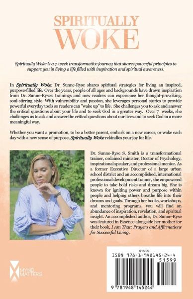 In Spiritually Woke, Dr. Sunne-Ryse shares spiritual strategies for living an inspired, purpose-filled life. Over the years, people of all ages and backgrounds have drawn inspiration from Dr. Sunne-Ryse's trainings and now readers can experience her thought-provoking, soul-stirring style. With vulnerability and passion, she leverages personal stories to provide powerful everyday tools so readers can "wake up" to life. She challenges you to ask and answer the critical questions about your life and to seek God in a greater way. Over 7 weeks, she challenges us to ask and answer the critical questions about our lives and to seek God in a more meaningful way. Whether you want a promotion, to be a better parent, embark on a new career, or wake each day with a new sense of purpose, Spiritually Woke rekindles your joy for life.