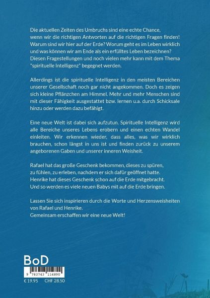 Die aktuellen Zeiten des Umbruchs sind eine echte Chance, wenn wir die richtigen Antworten auf die richtigen Fragen finden! Warum sind wir hier auf der Erde? Worum geht es im Leben wirklich und was können wir am Ende als ein erfülltes Leben bezeichnen?Diesen Fragestellungen und noch vielen mehr kann mit dem Thema "spirituelle Intelligenz" begegnet werden.Allerdings ist die spirituelle Intelligenz in den meisten Bereichen unserer Gesellschaft noch gar nicht angekommen. Doch es zeigen sich kleine Pflänzchen am Himmel. Mehr und mehr Menschen sind mit dieser Fähigkeit ausgestattet bzw. lernen u.a. durch Schicksale hinzu oder werden dazu befähigt.Eine neue Welt ist dabei sich aufzutun. Spirituelle Intelligenz wird alle Bereiche unseres Lebens erobern und einen echten Wandel einleiten. Wir erkennen wieder, dass alles, was wir wirklich brauchen, schon längst in uns ist und finden zurück zu unserem angeborenen Gaben und unserer inneren Weisheit.Rafael hat das große Geschenk bekommen, dieses zu spüren, zu fühlen, zu erleben, nachdem er sich dafür geöffnet hatte. Henrike hat dieses Geschenk schon auf die Erde mitgebracht.Und so werden es viele neuen Babys mit auf die Erde bringen.Lassen Sie sich inspirieren durch die Worte und Herzensweisheiten von Rafael und Henrike.Gemeinsam erschaffen wir eine neue Welt!