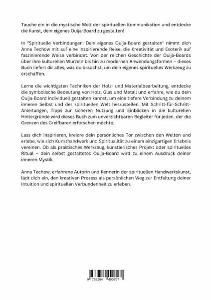 In "Spirituelle Verbindungen: Dein eigenes Ouija-Board gestalten" nimmt dich Anna Techow mit auf eine inspirierende Reise, die Kreativität und Esoterik auf faszinierende Weise verbindet. Von der reichen Geschichte der Ouija-Boards über ihre kulturellen Wurzeln bis hin zu modernen Anwendungsformen - dieses Buch liefert dir alles, was du brauchst, um dein eigenes spirituelles Werkzeug zu erschaffen.Lerne die wichtigsten Techniken der Holz- und Materialbearbeitung, entdecke die symbolische Bedeutung von Holz, Glas und Metall und erfahre, wie du dein Ouija-Board individuell gestalten kannst, um eine tiefere Verbindung zu deinem inneren Selbst und der spirituellen Welt herzustellen. Mit Schritt-für-Schritt-Anleitungen, Tipps zur sicheren Nutzung und Einblicken in die kulturellen Hintergründe wird dieses Buch zum unverzichtbaren Begleiter für jeden, der die Grenzen des Greifbaren erforschen möchte.Lass dich inspirieren, kreiere dein persönliches Tor zwischen den Welten und erlebe, wie sich Kunsthandwerk und Spiritualität zu einem einzigartigen Erlebnis vereinen. Ob als praktisches Werkzeug, künstlerisches Projekt oder spirituelles Ritual - dein selbst gestaltetes Ouija-Board wird zu einem Ausdruck deiner inneren Mystik.Anna Techow, erfahrene Autorin und Kennerin der spirituellen Handwerkskunst, lädt dich ein, den kreativen Prozess als persönlichen Weg zur Entfaltung deiner Intuition und spirituellen Verbundenheit zu erleben.