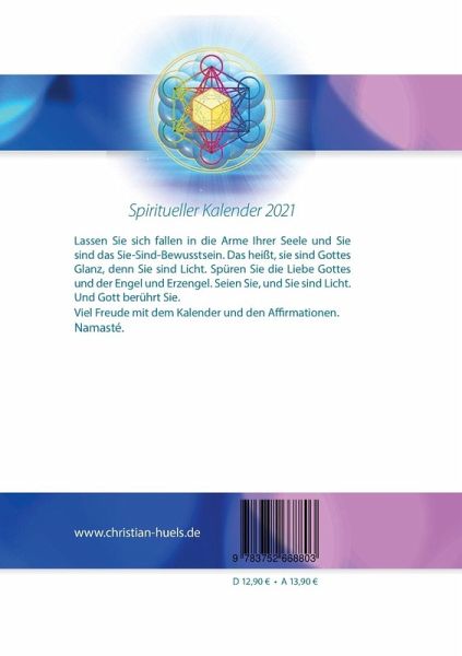 Lassen Sie sich fallen in die Arme Ihrer Seele und Sie sind das Sie-Sind-Bewusstsein. Das heißt, sie sind Gottes Glanz, denn Sie sind Licht. Spüren Sie die Liebe Gottes und der Engel und Erzengel. Seien Sie, und Sie sind Licht.Und Gott berührt Sie.Viel Freude mit dem Kalender und den Affirmationen.