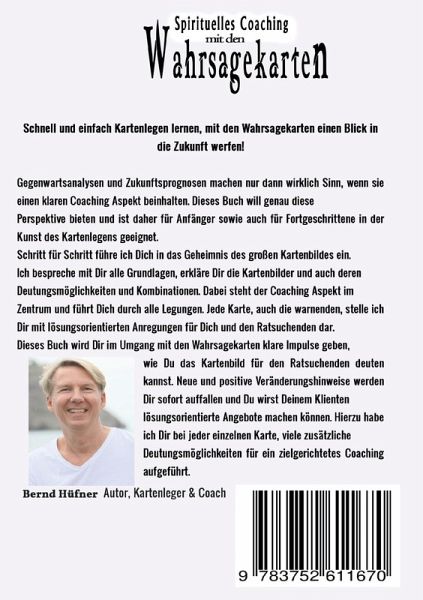 Neuauflage und neues Cover: Spirituelles Coaching mit den Zigeuner Wahrsagekarten!Schnell und einfach Kartenlegen lernen, mit den Wahrsagekarten einen Blick in die Zukunft werfen!Gegenwartsanalysen und Zukunftsprognosen machen nur dann wirklich Sinn, wenn sie einen klaren Coaching Aspekt beinhalten. Dieses Buch will genau diese Perspektive bieten und ist daher für Anfänger sowie auch für Fortgeschrittene in der Kunst des Kartenlegens geeignet. Schritt für Schritt führe ich Dich in das Geheimnis des großen Kartenbildes ein. Ich bespreche mit Dir alle Grundlagen, erkläre Dir die Kartenbilder und auch deren Deutungsmöglichkeiten und Kombinationen. Dabei steht der Coaching Aspekt im Zentrum und führt Dich durch alle Legungen. Jede Karte, auch die warnenden, stelle ich Dir mit lösungsorientierten Anregungen für Dich und den Ratsuchenden dar. Dieses Buch wird Dir im Umgang mit den Wahrsagekarten klare Impulse geben, wie Du das Kartenbild für den Ratsuchenden deuten kannst. Neue und positive Veränderungshinweise werden Dir sofort auffallen und Du wirst Deinem Klienten lösungsorientierte Angebote machen können. Hierzu habe ich Dir bei jeder einzelnen Karte, viele zusätzliche Deutungsmöglichkeiten für ein zielgerichtetes Coaching aufgeführt.Dieses Buch ist offizielles Lehr- & Begleitbuch zu meinem gleichnamigen Onlinekurs: "Spirituelles Coaching mit Karten", den Du auf der Onlineplattform: udemy.com unter (www.udemy.com/spirituelles-coaching-mit-karten/) findest. Hier biete ich Dir nach erfolgreichem Abschluss der "kleinen Berufsausbildung" die Möglichkeit, eine Prüfung mit Zertifikat abzulegen.