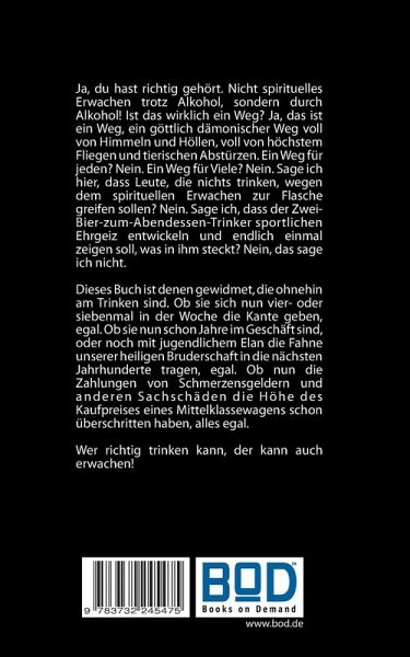 Ja, du hast richtig gehört. Nicht spirituelles Erwachen trotz Alkohol, sondern durch Alkohol! Ist das wirklich ein Weg? Ja, das ist ein Weg, ein göttlich dämonischer Weg voll von Himmeln und Höllen, voll von höchstem Fliegen und tierischen Abstürzen. Ein Weg für jeden? Nein. Ein Weg für Viele? Nein. Sage ich hier, dass Leute, die nichts trinken, wegen dem spirituellen Erwachen zur Flasche greifen sollen? Nein. Sage ich, dass der Zwei-Bier-zum-Abendessen-Trinker sportlichen Ehrgeiz entwickeln und endlich einmal zeigen soll, was in ihm steckt? Nein, das sage ich nicht. Dieses Buch ist denen gewidmet, die ohnehin am Trinken sind. Ob sie sich nun vier- oder siebenmal in der Woche die Kante geben, egal. Ob sie nun schon Jahre im Geschäft sind, oder noch mit jugendlichem Elan die Fahne unserer heiligen Bruderschaft in die nächsten Jahrhunderte tragen, egal. Ob nun die Zahlungen von Schmerzensgeldern und anderen Sachschäden die Höhe des Kaufpreises eines Mittelklassewagens schon überschritten haben, alles egal. Wer richtig trinken kann, der kann auch erwachen!